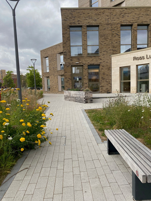 The new space to the east of the building is to act as a full stop and focal point for the existing pedestrian boulevard running through the campus. Influence approached the design of the ground floor as a series of inter-connected spaces intended to lead and direct users of the campus to the building. To the centre of the space the ground plane is modulated and a gentle ramped surface carves out a seating arena amongst raised planting beds. The external spaces provide areas for quiet contemplation, whilst also allowing large numbers of people to gather at the heart of this new civic square.
